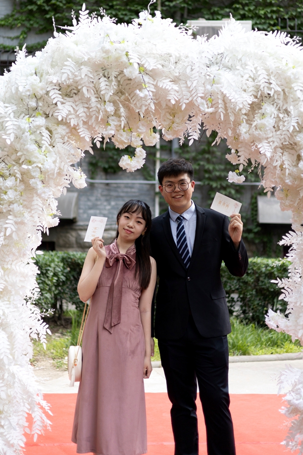 一簇簇散发勃勃生机的花束在阳光下熠熠生辉,红地毯在林荫道上徐徐铺开,粉色的拱门矗立其上,白色的轻纱随风飘扬,见证着2021届毕业生人生中光荣又珍贵的时刻。以学院精心准备的签名墙为起点,毕业生在此留下签名和感言。画上精致的妆容,身着典雅的礼服,毕业生们或伴老师,或手牵挚友款款走上红毯,每个毕业生作为主角在背景墙上合影留念,留下了弥足珍贵的瞬间。精彩的亮相,个性的签名,每位毕业生都是今日的主角。红毯上秀出风采,演绎最美告别,抒发对母校骄傲自豪和依依不舍之情。本次红毯秀共分为“经院·初遇”、“青春·芳华”、“云端·畅想”、“果敢·前行”、“百廿·恰少年”“感恩·师说”“经生·展望”七个主题。同学们回忆往昔峥嵘岁月,彼此嘱咐“青衫不负踏歌行,莫忘曾经是书生”,恰逢百廿校庆,同学们诉说对母校的寄语与祝福,郑重承诺“凡我在处,便是山大”。“百廿·恰少年”毕业红毯秀在同学们打卡留念、欢声笑语、诉说别情祝福下圆满落幕,作为校园里一道亮丽的风景,让毕业生们的青春不留遗憾,为浓浓的毕业季添上了最华丽的一笔。