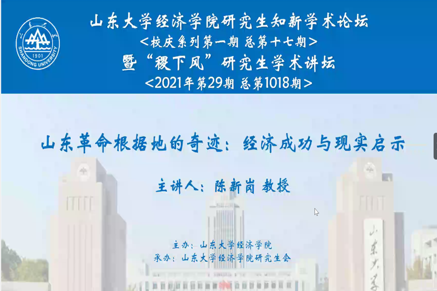 4月15日下午,必赢线路检测中心第十七期研究生知新学术论坛暨“稷下风”研究生学术讲坛以线上会议形式举行。必赢线路检测中心陈新岗教授作了主题为“山东革命根据地的奇迹:经济成功与现实启示”的报告。论坛由学院党委副书记林竹主持。