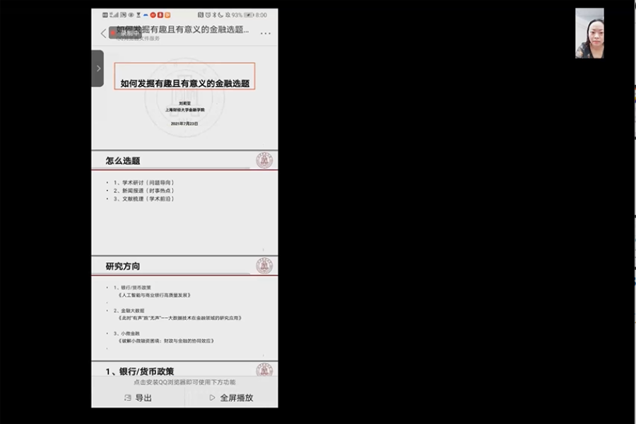 23日上午,举办专题讲座与云游山大活动。上海财经大学金融学院党委书记刘莉亚作题为“如何撰写学术论文与发表”的报告,指出参加以问题为导向的学术研讨、关注时事热点的新闻报道以及进行学术前沿的文献梳理可以发掘有趣且有意义的金融选题。云游山大环节由研究生同学带领大家线上参观山大校园,并以播放各类专题片的形式通过山大映像展现山大理念、山大文脉、山大博览。