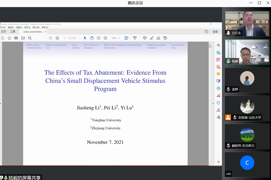 陆毅教授做了题为“The effects of tax abatement: evidence from china's small-displacement vehicle stimulus program”的报告。报告分析了2015年针对小排量汽车车辆购置税减免政策的效应,并进行了效应分解与福利分析。