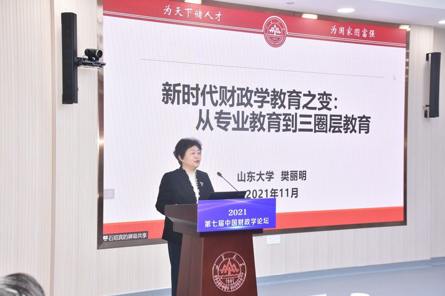 樊丽明教授做了题为“新时代财政学教育之变:从专业教育到三圈层教育”的报告。报告分析了新时代财政学教育之变的逻辑,认为在两个一百年交汇点上,财政学教育也应发生时代之变,并提出新时代应当构建财政学“专业教育、通识教育、社会教育”三圈层教育体系。