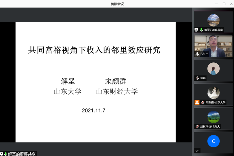 解垩教授做了题为“共同富裕视角下收入的邻里效应研究”的报告。报告基于共同富裕的视角,分析了居民收入的社区邻里效应及其异质性特征,为解决相对贫困问题提供了新思路。