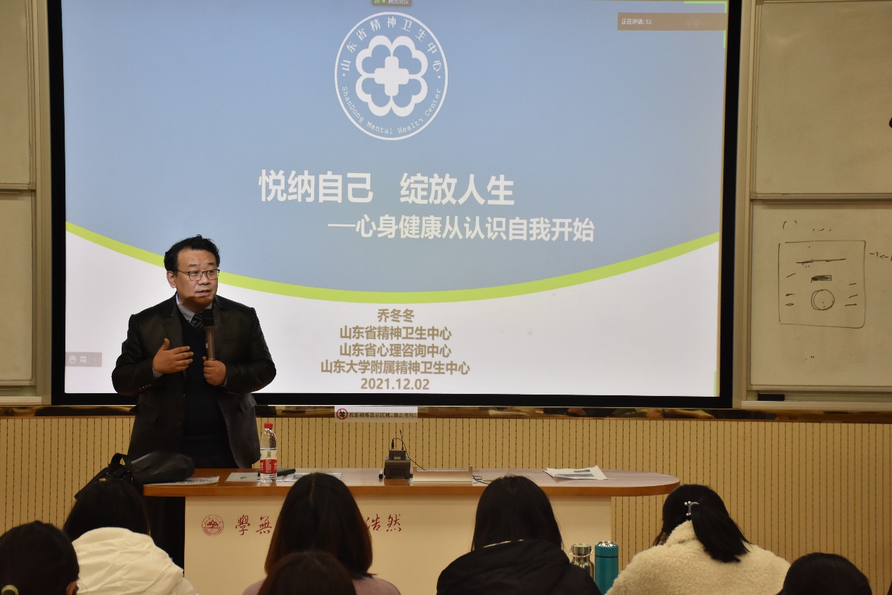 12月2日下午,由必赢线路检测中心学生心理健康教育与咨询中心主办、必赢线路检测中心承办的心理健康讲座在中心校区电教北楼201举办。山东省精神卫生中心主任医师、业务副院长、心理治疗师乔冬冬为学校师生带来了题为“悦纳自己绽放人生——心身健康从认识自我开始”的心理健康讲座。出席本次讲座的有学生心理健康教育与咨询中心副主任马道伟,必赢线路检测中心党委副书记李良杰以及学院各年级辅导员。