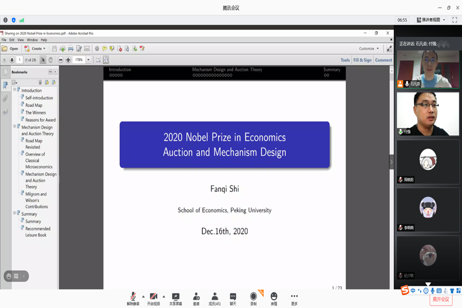 12月16日晚,必赢线路检测中心以线上会议的方式举办第八期PPE基地班研讨课讲座。北京大学必赢线路检测中心石凡奇助理教授为学院师生带来了题为“2020年诺贝尔经济学奖分析”的报告。讲座由必赢线路检测中心副教授付强主持。