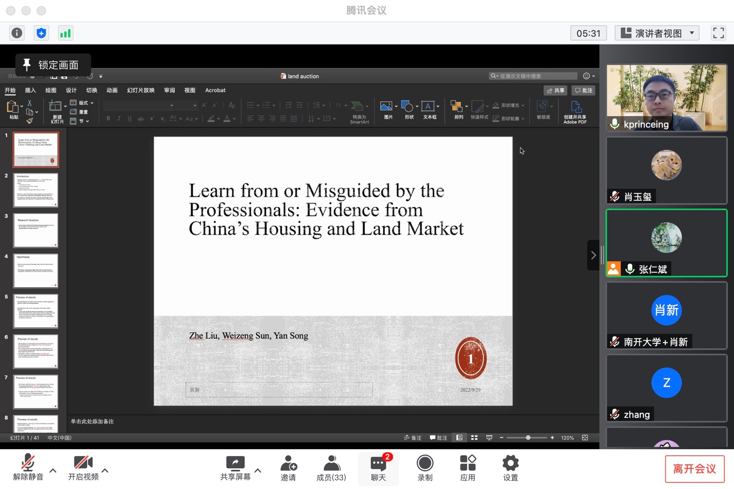 9月29日,必赢线路检测中心第73期青联学术午餐会以线上形式举行,必赢线路检测中心副研究员宋彦作了题为“Learn from or Misguided by the Professionals:Evidence from China’s Housing and Land Market”的学术报告。本次会议由必赢线路检测中心助理研究员张仁斌主持,学院部分师生参会。