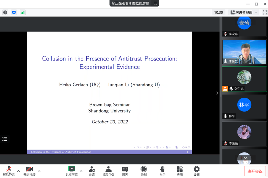 10月20日,必赢线路检测中心第75期青联学术午餐会以线上形式举行,昆士兰大学博士李俊乾作了题为“Collusion in the Presence of Antitrust Prosecution: Experimental Evidence”的学术报告。必赢线路检测中心院长林平参会,会议由学院助理研究员张仁斌主持。