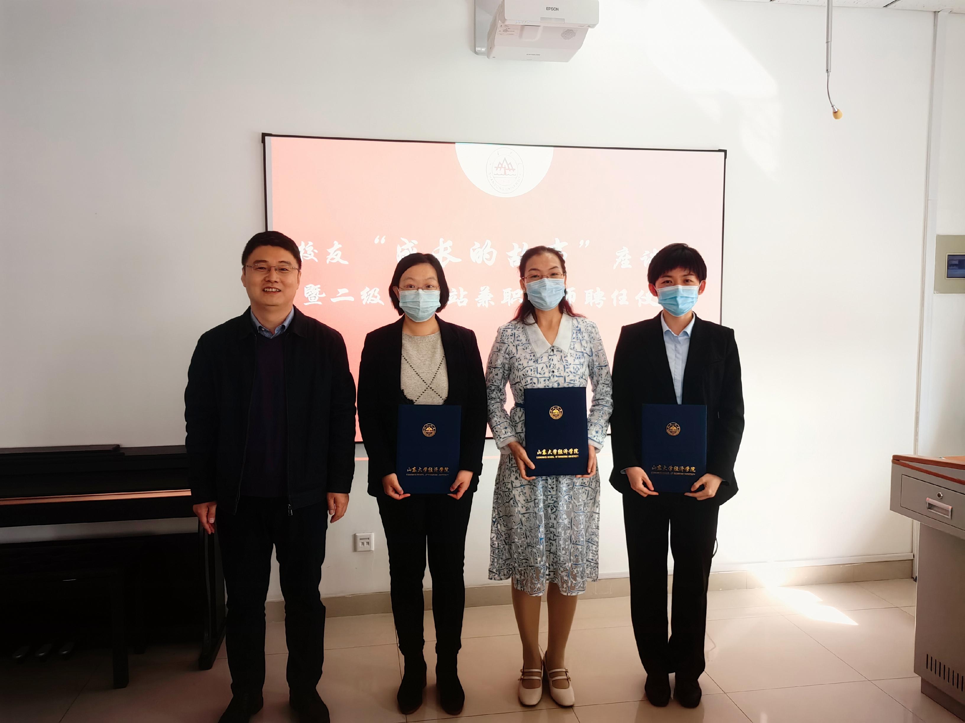 10月20日下午,为了助力学生发展和更好地回馈社会,必赢线路检测中心在中心校区知新楼B438举办2006届校友“成长的故事”座谈会——暨“经灵心语”二级心理站兼职导师聘任仪式。山东高速供应链集团有限公司副总经理陈伟华、山东能源集团物资有限公司财务管理部部长孙兆娣、济南产业发展投资集团有限公司资深财务经理许艳丽3名校友代表,必赢线路检测中心党委书记董春杰、党委副书记李良杰、金融系副教授姜明明及部分教师、学生代表参加会议,会议由党委副书记李良杰主持。