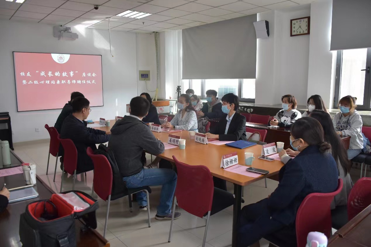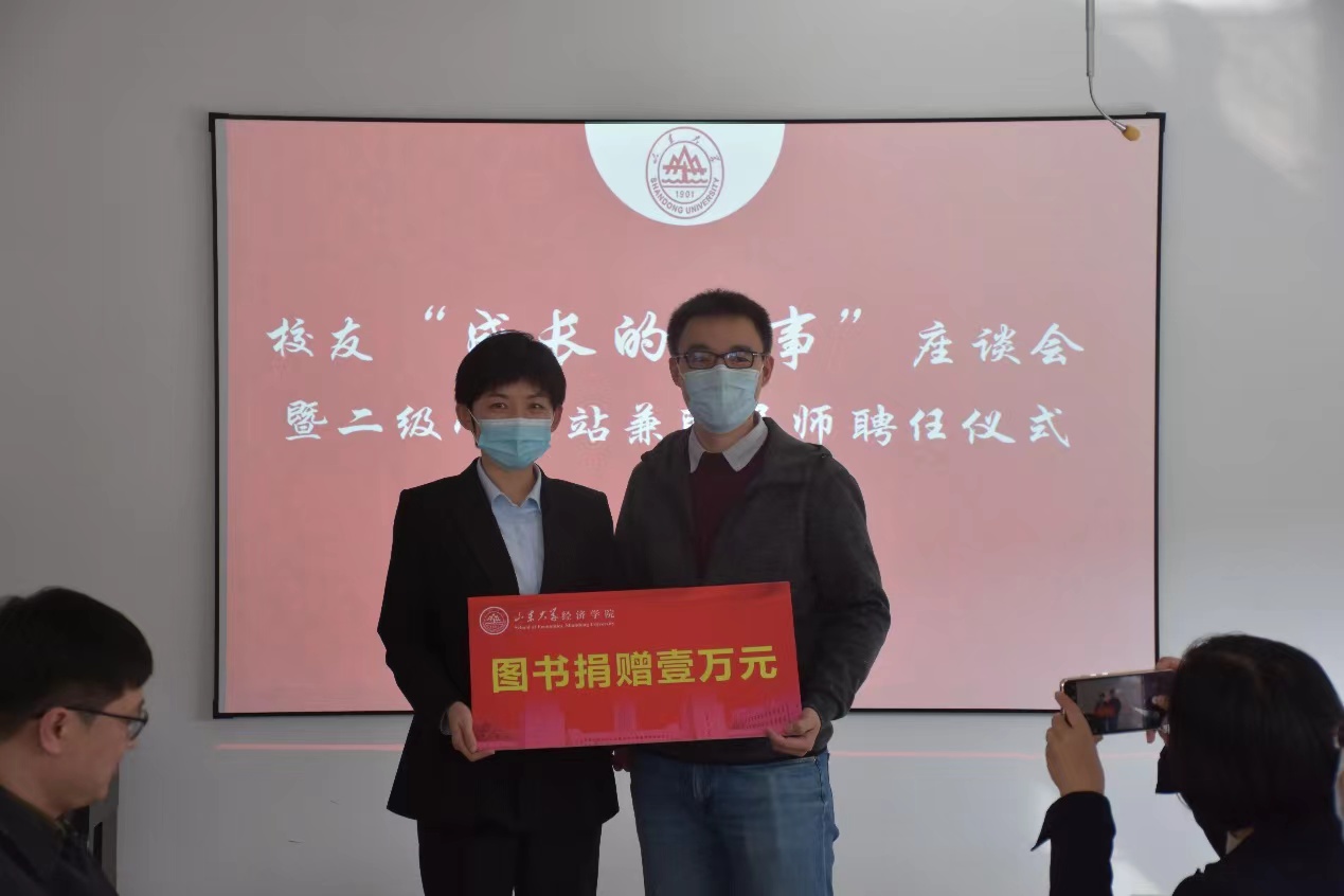 座谈会上,董春杰为三位校友颁发了二级心理辅导站兼职导师聘书,姜明明代表学院接受了校友捐赠。