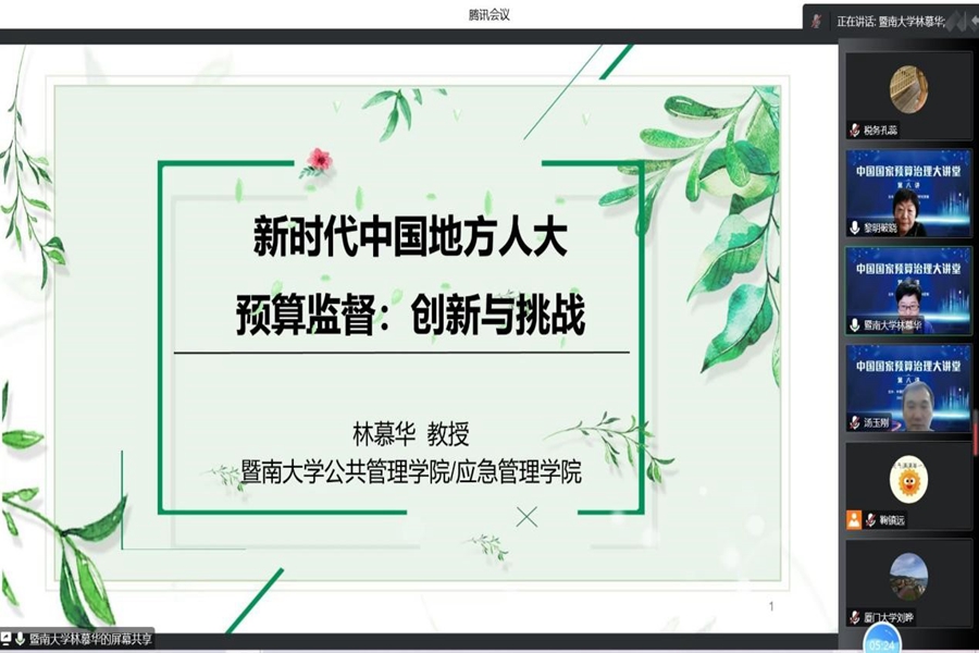 10月23日下午,中国国家预算治理研究联盟主办的“中国国家预算治理大讲堂”第八讲开讲。暨南大学公共管理学院、应急管理学院林慕华教授应邀做客讲堂并作了题为“新时代地方人大预算监督的创新与挑战”的报告。必赢线路检测中心原校长、联盟理事长樊丽明教授出席报告会。
