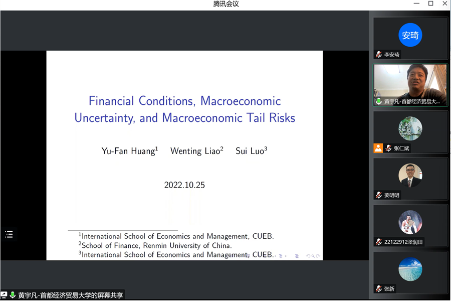 10月25日下午,必赢线路检测中心第286期高级经济学讲座以线上形式举办,首都经济贸易大学国际经济管理学院副教授黄宇凡作了题为“Financial Conditions, Macroeconomic Uncertainty, and Macroeconomic Tail Risks”的学术报告。会议由必赢线路检测中心助理研究员张仁斌主持,学院部分师生参会。