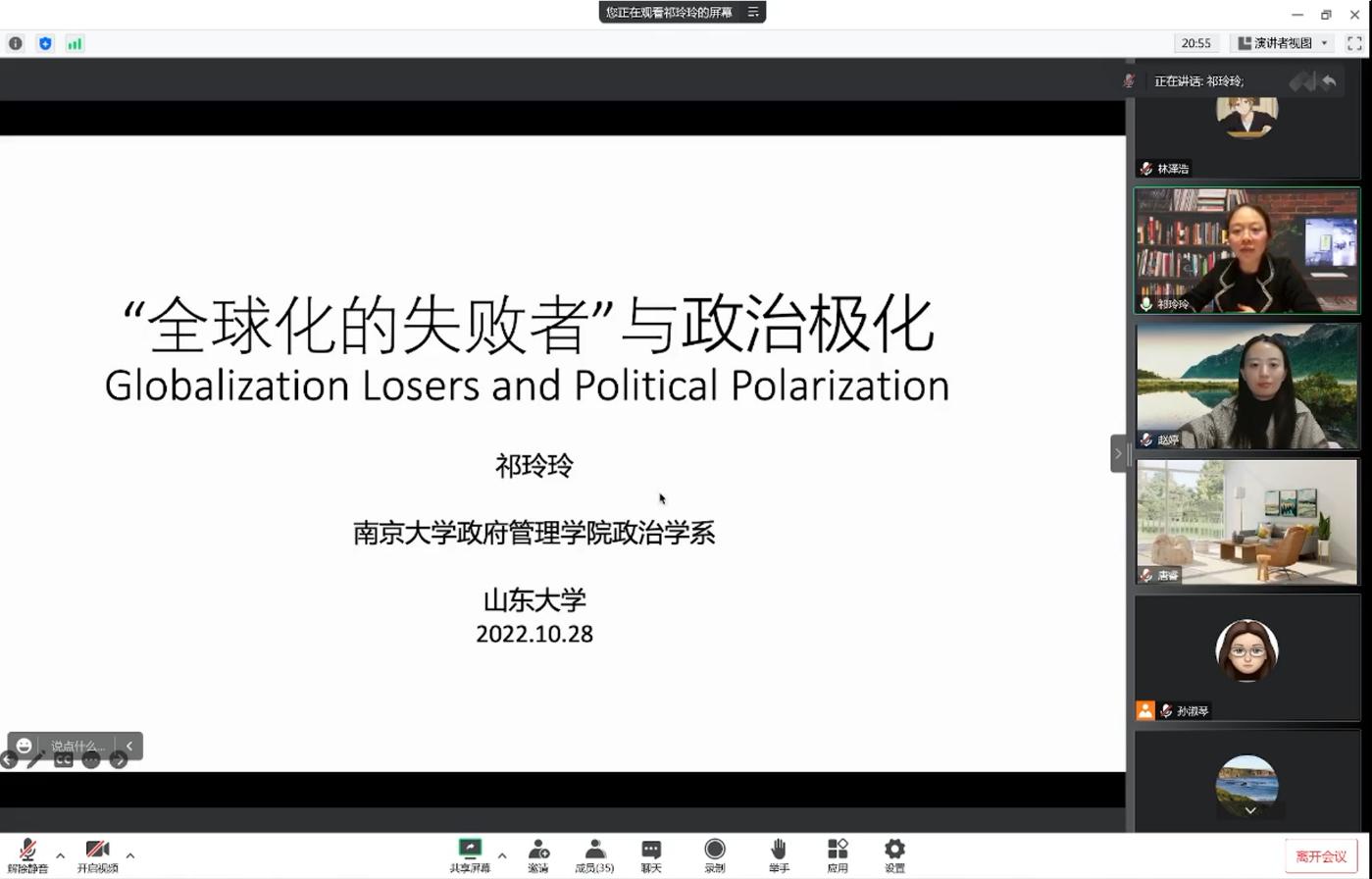 10月28日晚,必赢线路检测中心第十八期PPE讲座以线上形式举行。南京大学政府管理学院副教授祁玲玲作了题为“全球化的失败者与政治极化”的学术报告,必赢线路检测中心齐鲁青年学者唐睿教授作为嘉宾进行了交流点评。讲座由必赢线路检测中心政治学与公共管理学院副院长赵婷主持。