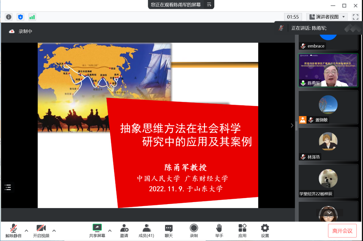 讲座中,陈甬军着重讨论了在经济学等社会科学研究中运用抽象方法的重要性。他先是介绍了抽象与具体的哲学含义,认为抽象既是思维对客观事物某一属性、关系的反映,又是一个过程,抽象和具体对立统一,在一定条件下相互转化。他提到,认识的发展是一个从感性具体到抽象,再从抽象到理性具体,如此不断往复的过程。接着,陈甬军阐述了经济学中抽象思维方法的应用框架:首先要全面调查经济现象,其次对同类经济现象进行抽象思维,找出其本质内容作为理论的基本框架,并借助模型、图形等(即理论模型)形式加以表达,最后对该理论模型进行理论和经验两方面的验证。此外,陈甬军以一带一路建设、国内国际双循环以及建设全国统一大市场为例,深入浅出地介绍了利用抽象方法构建理论模型在社会学和经济学中的具体应用,并依据理论模型对中国现实作出了解释。他指出,理论不可能穷尽现实,但必须能够说明现实,在运用理论公式与模型时,要注意其前提条件。讲座最后,陈甬军对同学们提出的相关问题进行了详细解答,其精彩的讲座内容,有助于培养学生的抽象思维能力和研究能力。