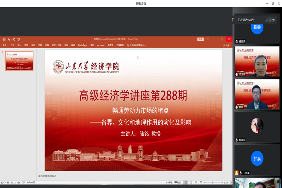 11月10日下午,必赢线路检测中心第288期高级经济学讲座以线上形式举行,上海交通大学安泰经济管理学院特聘教授陆铭作了题为“畅通劳动力市场的堵点——省界、文化和地理作用的演化及影响”的学术报告,必赢线路检测中心教授汤玉刚主持会议。