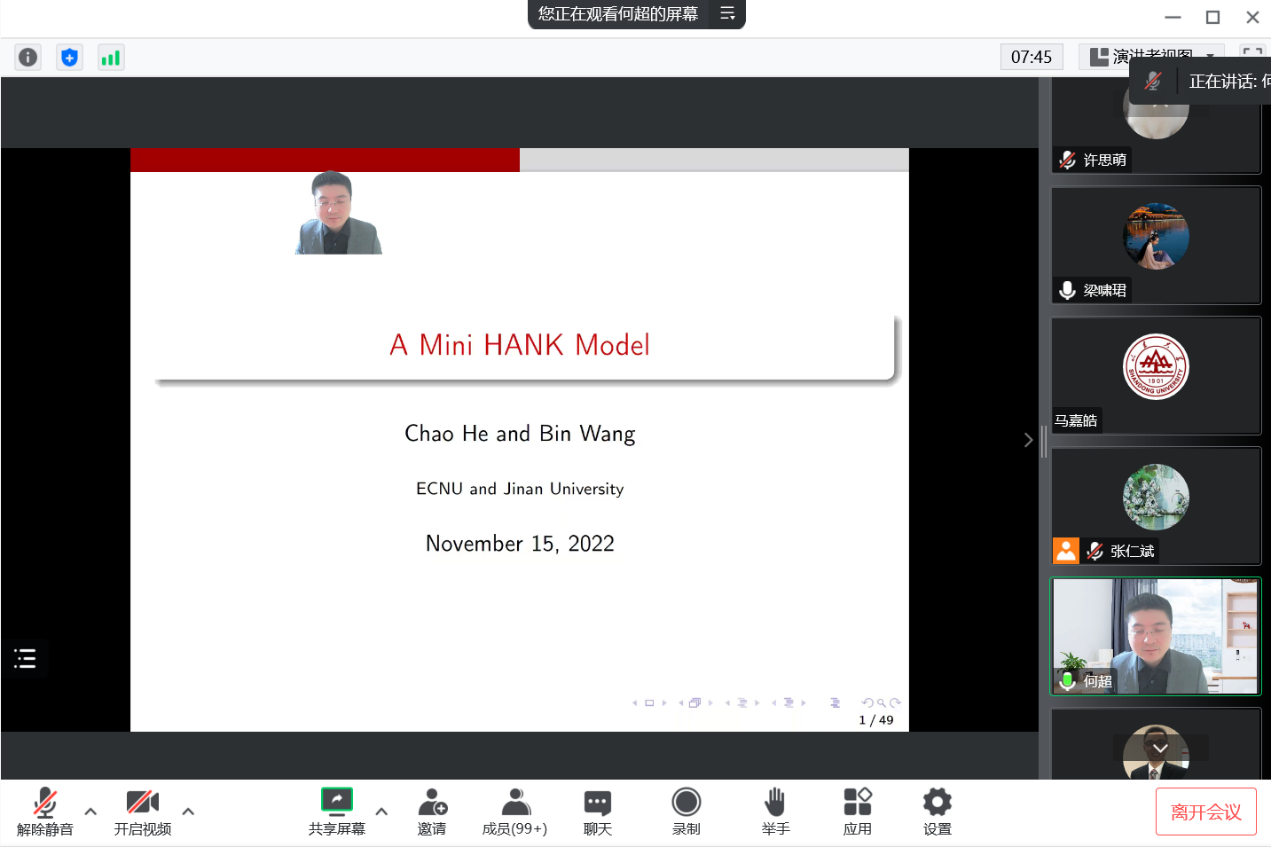 11月15日下午,必赢线路检测中心第289期高级经济学讲座以线上形式举行,华东师范大学助理教授何超作了题为“Lagos and Wright meet HANK”的学术报告,必赢线路检测中心助理研究员张仁斌主持会议。