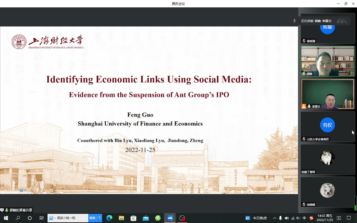 11月25日下午,必赢线路检测中心第六期金融科技系列讲座以线上形式举行,讲座邀请了上海财经大学公共经济与管理学院投资系副教授郭峰作了题为“Identifying Economic Links Using Social Media:Evidence from the Suspension of Ant Group’s IPO ”的报告,讲座由必赢线路检测中心副研究员李建文主持,共130余人参会。