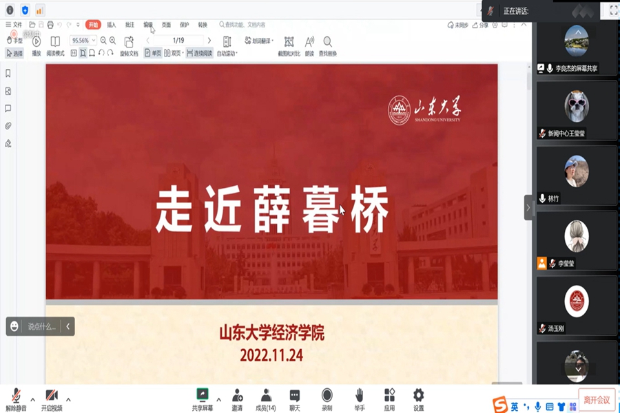 院长林平指出,讲述薛暮桥故事、展示薛暮桥事迹、传承薛暮桥精神是学院深入贯彻落实党的二十大精神、推动落实学校文化引领战略的重要举措。我们要进一步全面挖掘薛暮桥先生的生平事迹,通过开展实地探看、馆藏调研、相关人物寻访等进一步搜集丰富历史资料;要进一步挖掘薛暮桥先生的经济学思想精髓,结合经济思想史研究等积极组织动员学院科研力量,从现代经济学角度出发,丰富薛暮桥经济思想研究成果;要充分发挥“薛暮桥”文化品牌的学术价值,聚焦经济领域的重大理论和实践问题,结合学科特色,将关于薛暮桥先生的研究计划与谋划各类重大科研项目相结合,与智库建设及服务山东工作相结合,全方位、立体式地走近薛暮桥。