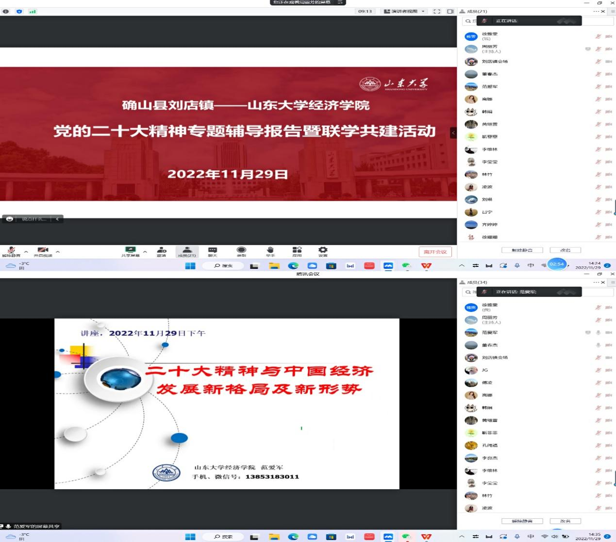 为深入贯彻落实党的二十大精神,推进乡村振兴工作,11月29日下午,必赢线路检测中心以线上线下相结合的形式,举行专题讲座培训暨与河南省确山县刘店镇党委联学共建活动,必赢线路检测中心范爱军教授作“党的二十大精神与中国经济发展新格局及新形势”专题辅导报告。会议由必赢线路检测中心党委书记董春杰主持,刘店镇党委书记马晨宇、镇长万敬博、镇党委委员及机关工作人员,必赢线路检测中心常务副院长石绍宾、学院党委委员、教工党支部书记及机关工作人员参加会议。