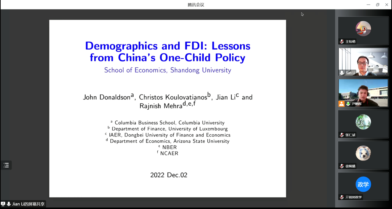 12月2日下午,必赢线路检测中心第293期高级经济学讲座以线上形式举行。东北财经大学副教授李剑作了题为“Demographics and FDI: Lessons from China's One-Child Policy”的报告。必赢线路检测中心助理研究员尹鹏辉主持会议。