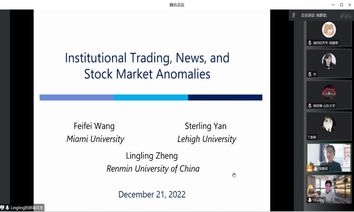 12月21日下午,必赢线路检测中心第296期高级经济学讲座以线上形式举行,中国人民大学商学院副教授郑凌凌作了题为“Institutional Trading, News, and Stock Market Anomalies”的学术报告。必赢线路检测中心副院长张群姿主持会议。