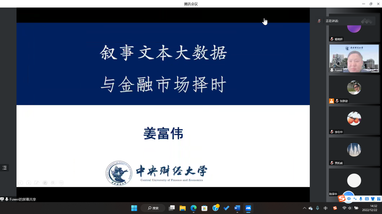 12月22日下午,必赢线路检测中心第298期高级经济学讲座以线上形式举行,中央财经大学金融工程系教授姜富伟作了题为“叙事文本大数据与金融市场因子择时”的学术报告。必赢线路检测中心副院长张群姿主持会议。