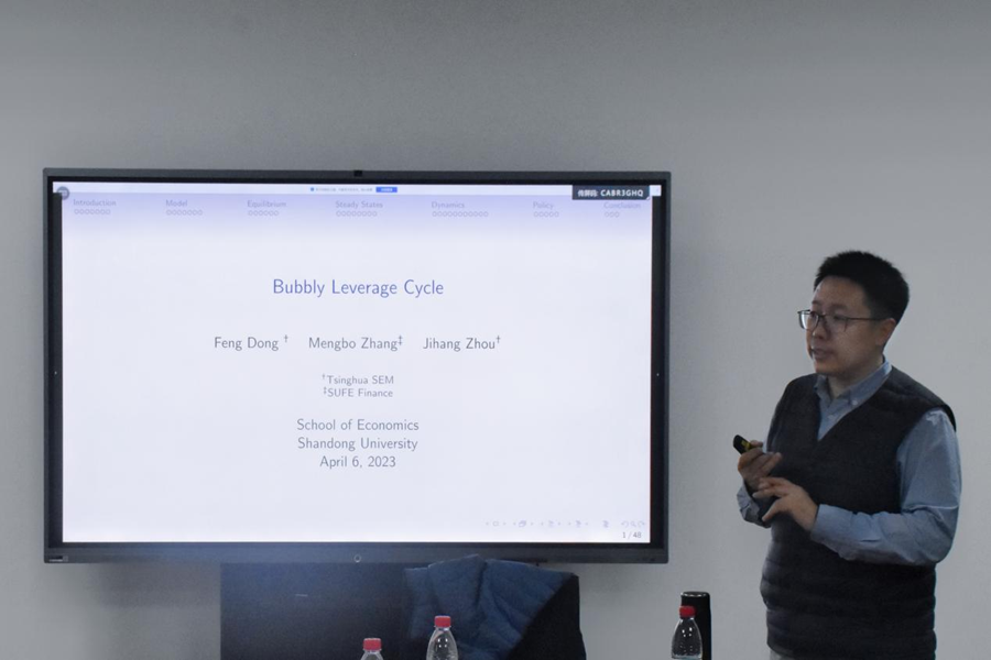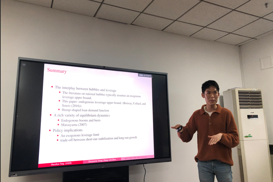 随后,汤皓州和朱维超对报告论文中的观点进行了总结,并分享了自己对资产泡沫与金融杠杆的观点和看法。通过帕累托分布的研究方法,得到了均衡市场出清的图像,同时提出了在均衡中泡沫不会破裂和将政府公债泡沫引入模型的理论构想。