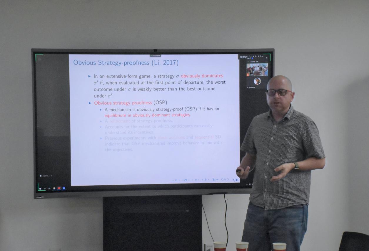 报告讲解了一个新的单边匹配市场机制系列——Pick-an-Object(PAO)机制。首先,报告介绍了PAO机制的分配规则,当通过PAO实施分配规则时,代理人被要求从个性化菜单中挑选一个对象,这些选择后来可能被拒绝,然后再向代理人提供新的菜单。当程序结束时,代理人被分配到他们最后挑选的对象。报告分析了可由PAO机制顺序化的分配规则,以及可在稳健真实均衡中实施的分配规则。报告指出,相对于直接机制而言,PAO的使用是合理的,因为它的均衡行为与明显策略保护 (OSP) 机制中的均衡行为密切相关,但实现了常用的规则(如TTC和SD),而这些规则是OSP无法实现的。最后,报告还讲解了针对PAO的实验室实验,比较了使用PAO、OSP和直接机制来实现不同规则时的真实行为。研究发现,代理人在PAO和OSP下的行为更有可能与理论预测一致。报告过程中,Inacio Bo就实验设计等问题与参会师生进行了充分探讨。